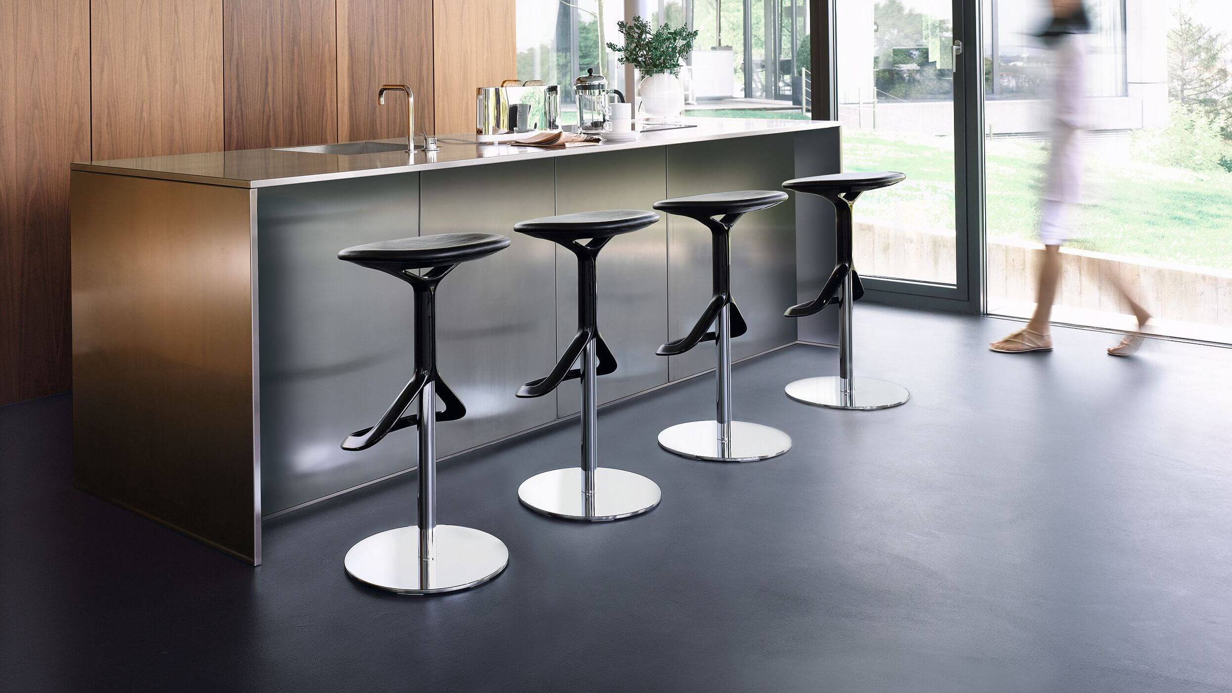Futuristischer Minimalismus. Entworfen vom Londoner Design Studio Pearson Lloyd, ist der Lox ein überraschend komfortabler Barhocker mit dynamischer Silhouette. Drehbar um 360°, stufenlos höhenverstellbar – der Verstellknopf ist unsichtbar unter dem Sitz integriert.